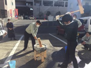 年末に社長と男性スタッフが力を合わせて餅つきをし、