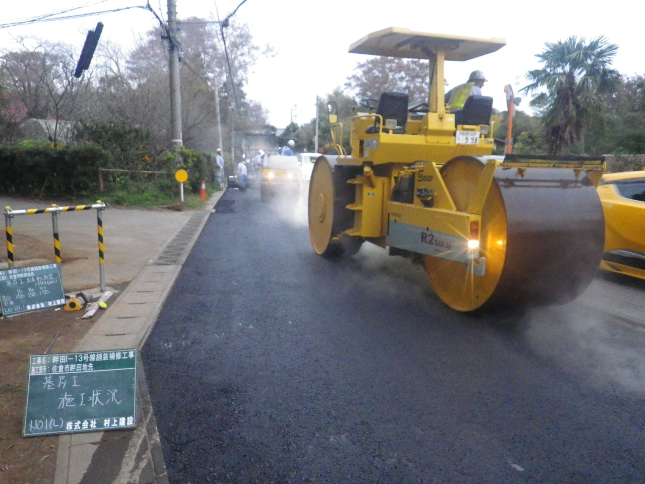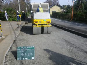 ↑既存舗版を撤去し、4tコンバインドローラにて転圧しています